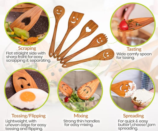 Multipurpose Smiley Heart Face Cherry Wood Cast Scraper Wooden Spoons for Cooking 5 Piece Spatula Set