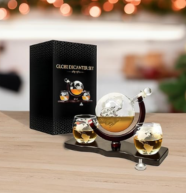 Whisky Liquor Globe Smoker Decanter Ship Designed Etched Glass Bottle Gift Box Set with 2 Glasses and Tray for Bar Home Decor Men's Valentine Gift