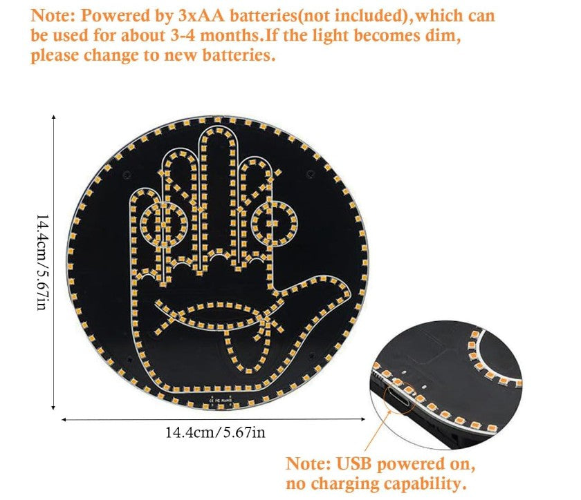 Simple Installation: Clean the surface before install, then affixed the led hand gesture for car to the inner glass of the window by the double-sided adhesive Velcro (package including), easy installation in any position of vehicle. Powered by 3xAA batteries (not included), which can be used for about 3-4 months. If the light becomes dim, please change to new batteries.