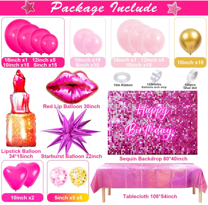 Balloons Galore: With an assortment of pink balloons in various sizes and shapes, including shimmering sequin balloons, you can create an eye-catching balloon arch that will be the centerpiece of the party.
