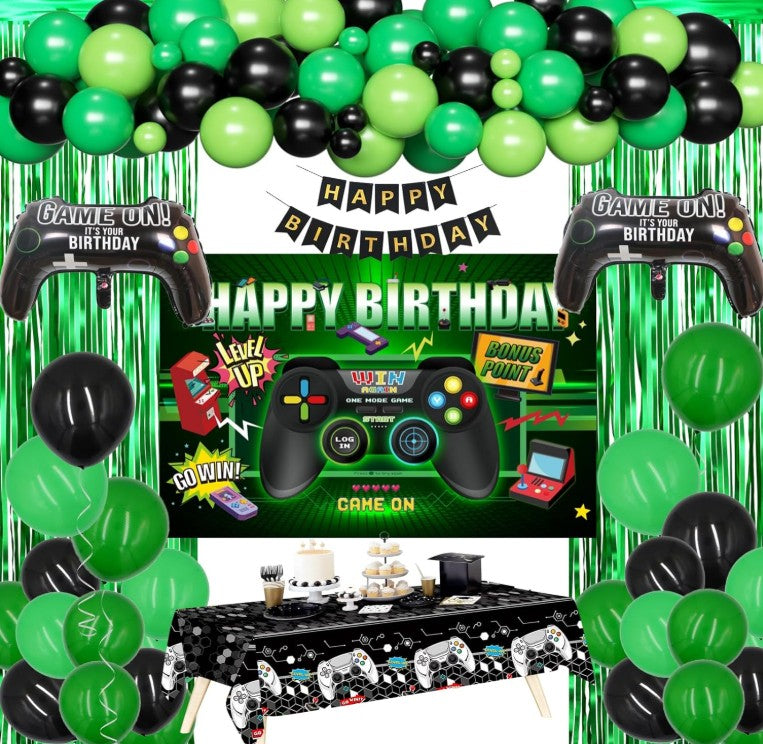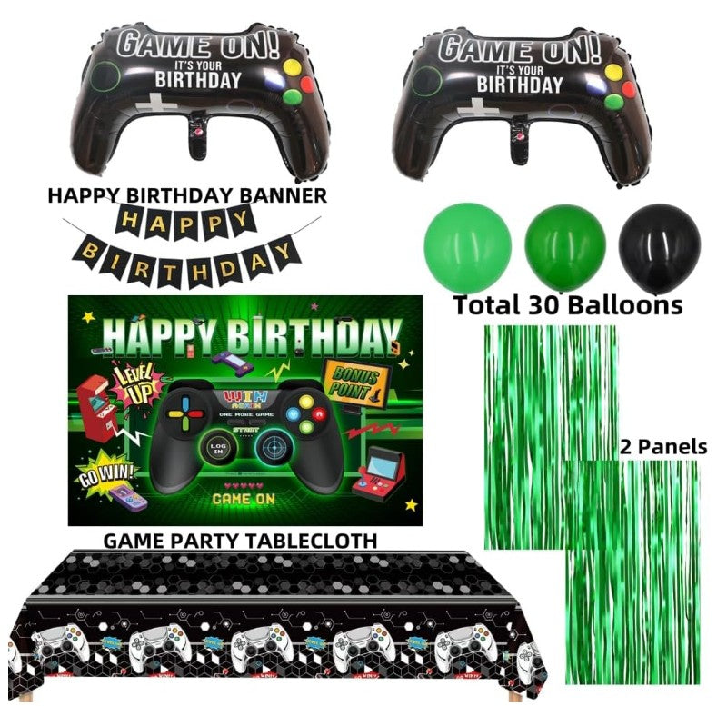 The Boys Green Video Game and Blue Classic Colors: All in one box video game decor. 1 pcs video game birthday backdrop, 2 pcs green metallic fringe curtain, 2 pcs small video game controller foil balloons, 1 pcs big video game tablecloth, 1 pcs happy birthday banner, 30 pcs latex balloons