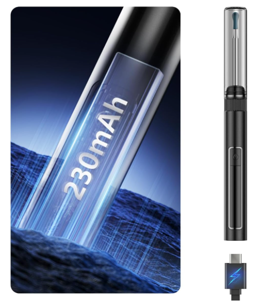 Thermostat Waterproof Long Battery Life: The ear removal tool camera has a built-in 230mAh rechargeable battery, which can be used for 70 minutes after a full charge and has a standby time of up to 30 days. The IP67 waterproof otoscope, ear spoon, and lens can be rinsed with water or wiped with alcohol cotton after each use. Do not submerge the entire otoscope in water.
