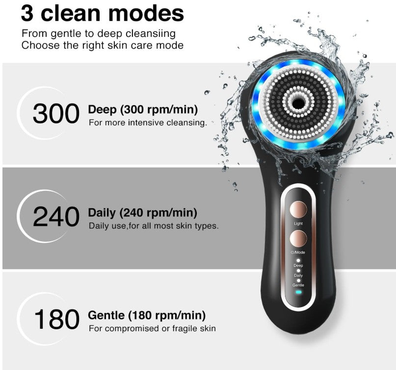 3 in 1 Facial Cleansing Brush System with 5 Heads: Includes 5 brush heads, 3 cleansing speeds (deep, daily, and gentle) for your choice of gentle cleansing to deep exfoliation. Effectively removes dirt, oil and makeup from the skin's surface, and tightens/tones even the most delicate skin.