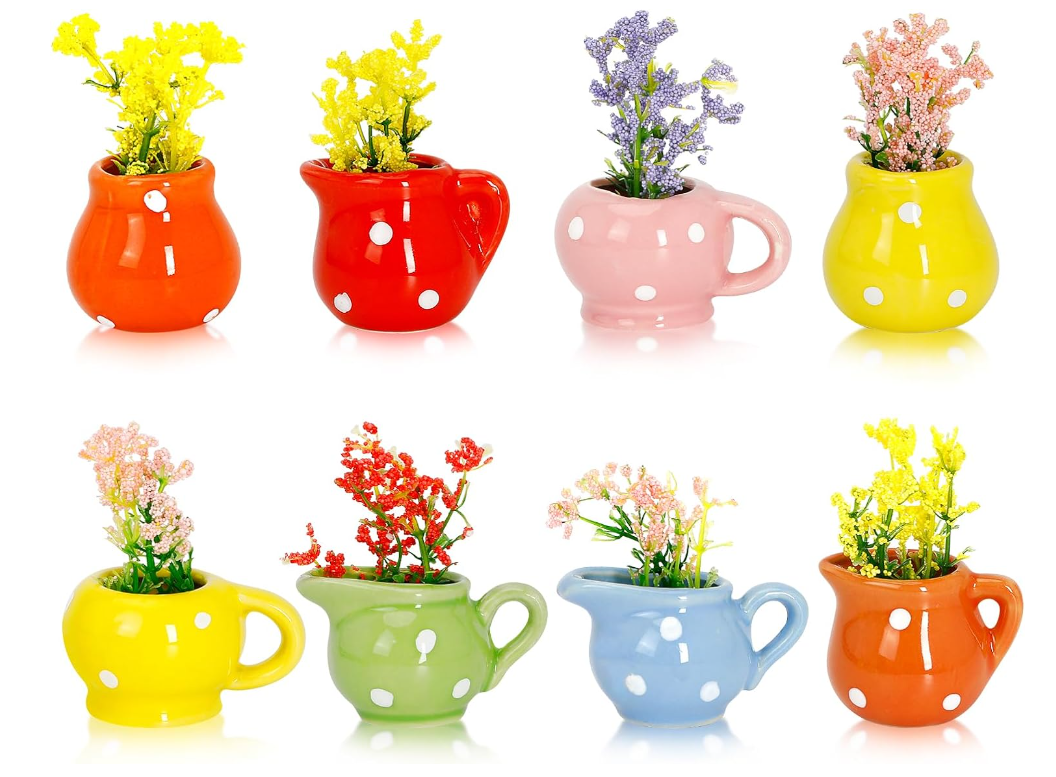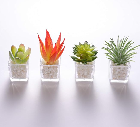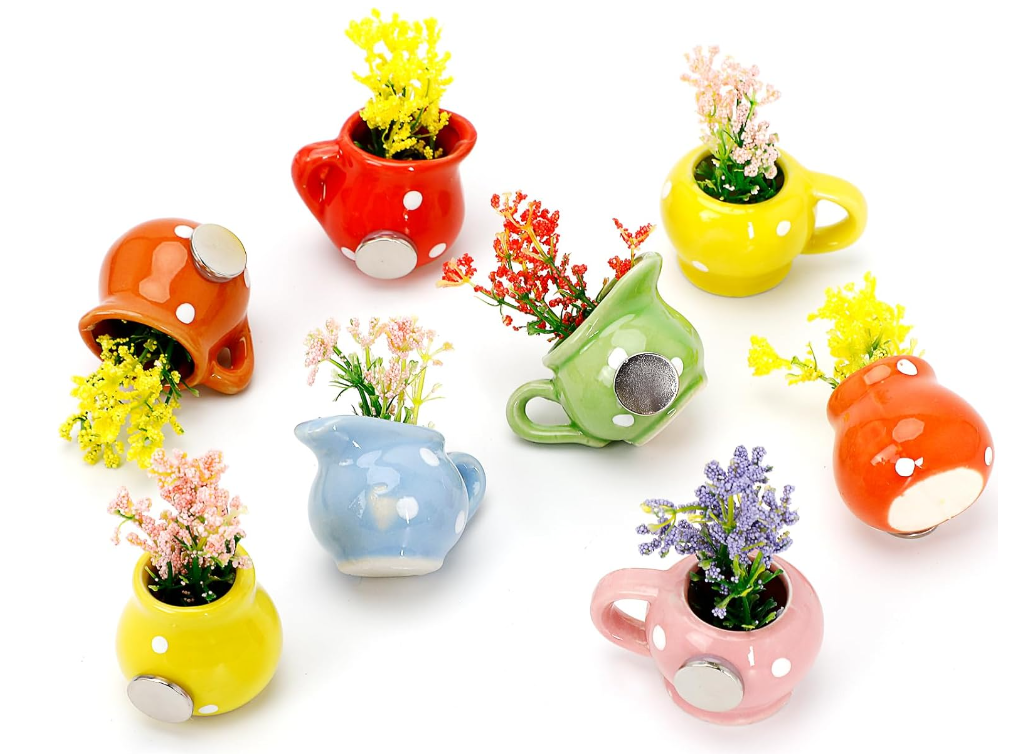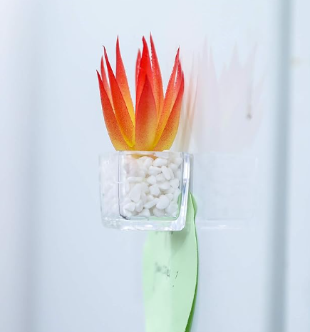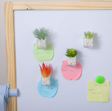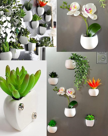 Mini Faux Potted Succulent Plants: Elevate your fridge with these fun magnets. In white, glass or flower ceramic pots with magnetic back panels. Magnetic is discretely hidden inside the back of the pot. Flushes against any surface and you don't see the magnet itself on the back. Choose from 7 styles of succulent's plants. Decorative for your fridge in these fun classic pots. Great for complementing and decorating any home, office or room space.