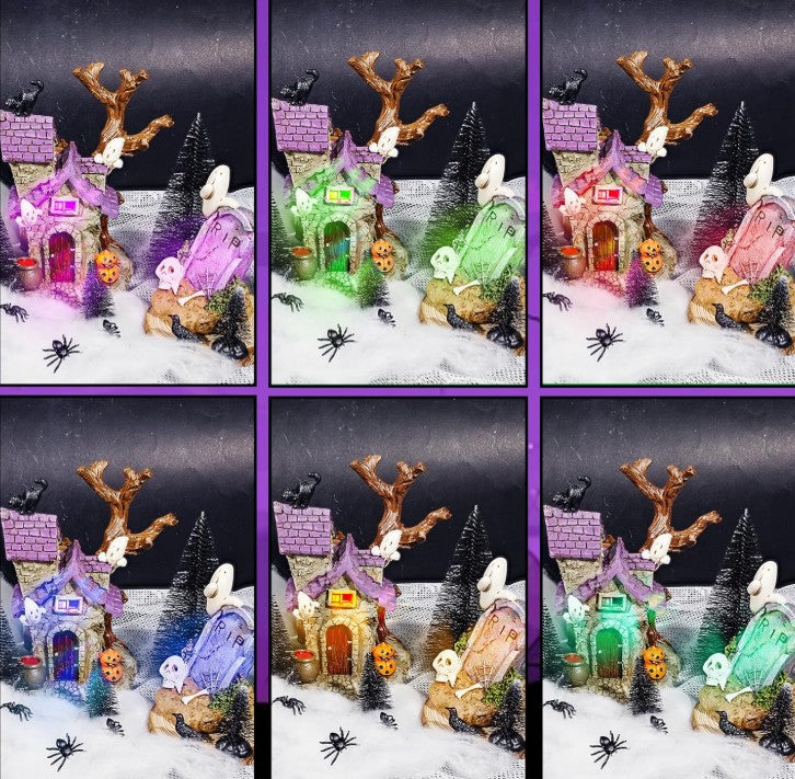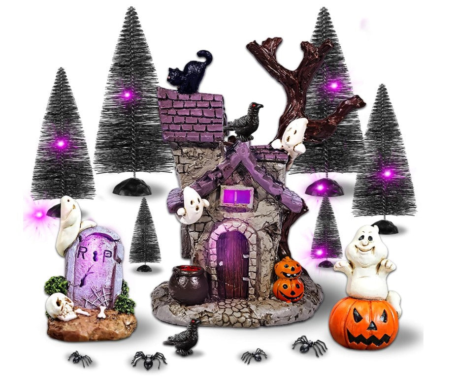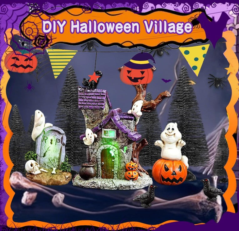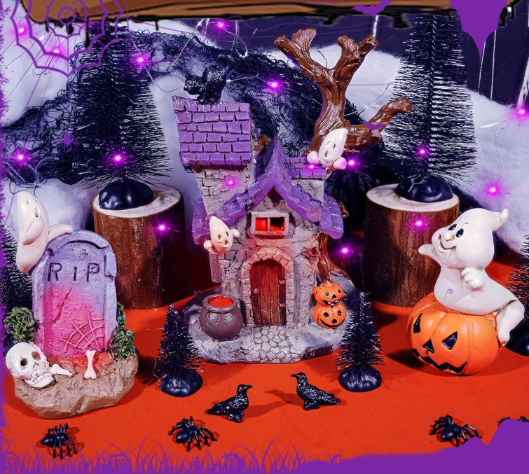 Adorable Halloween Village House: this Halloween house figurine has rich Halloween elements such as ghosts, dead tree, mini spider, ghost tombstone and pumpkins to match the spooky theme of Halloween party