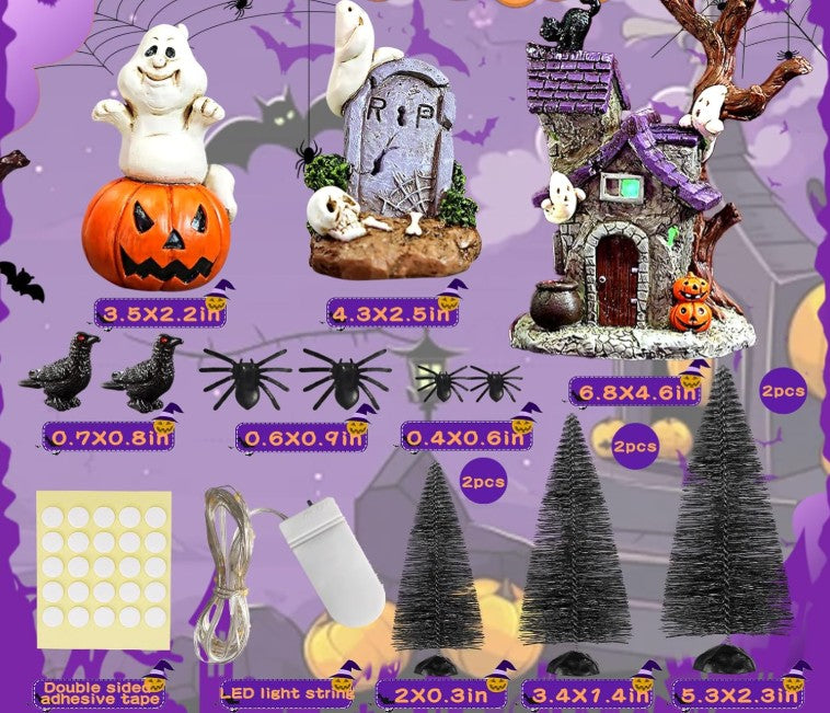 DIY Fun for Everyone: a ghost house figurine, a ghost pumpkin figurine, a ghost tomb, and four mini plastic spiders of different sizes; Two crows, six black Christmas trees of different sizes, and a double-sided tape sticker. You can place them freely