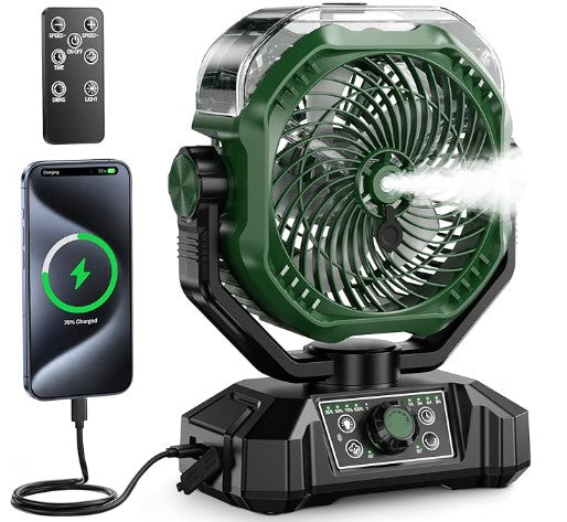 Misting Fan for Cool Summers Camping Backyard: 450mL Large Water Tank & Dual Spray Modes – Enjoy uninterrupted misting for 1.5–3 hours with two customizable spray options (continuous/intermittent), perfect for long-lasting comfort. 8-Speed Turbo Fan & 40" Long-Range Mist – Adjustable ultra-strong airflow propels refreshing mist up to 40 inches (1 meter), quickly cooling large rooms or outdoor spaces. 10,000mAh Rechargeable Battery & Phone Charger – A single charge powers 6–16 hours of operation (varies by fan speed). Use the built-in USB port to charge your phone on the go! 3-Color LED Mood Lighting. Smart Remote Control & Auto Swing – Effortlessly adjust power, spray mode, timer, 3 LED lights, and 90° auto-oscillation from across the room—no need to get up!