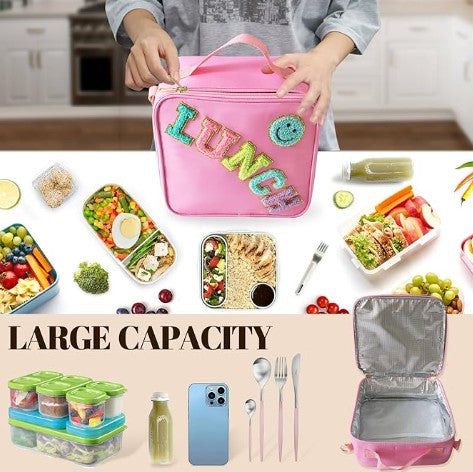 Large Capacity: The girls lunch bag measures 9 LX 9 W X 4.3H inches and features a compartment net for easy-to-reach items like cutlery or napkins. Such as put mobile phones, tissues, spoons, keys, wallets, sandwiches, salads, drinks and fruits, etc. Perfect for packing all your food and snacks for the day.