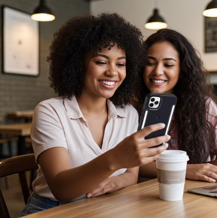 Social media Posting Essential Tool: Are you an influencer or someone that makes social media videos constantly. Find the right light in any situation. This phone case lights up a user's face with the simple push of a button in two different ways. When the case is put in action, the light fills in the shadows, enhancing the photo or video and making the subject bright, beautiful and 'picture perfect'. Comes in three colors black and rose gold.