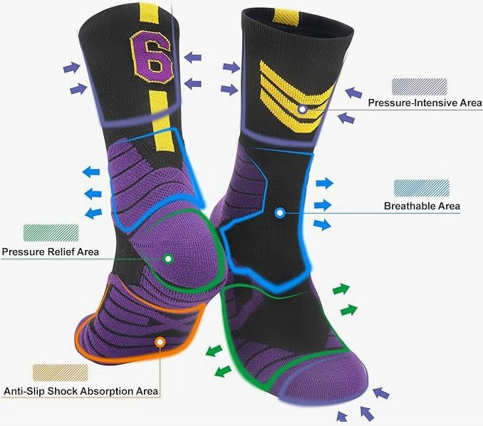 Show off your Team Player Spirit: in style with our Basketball Athletic Crew Socks featuring players' numbers in the vibrant colors of their team. Whether you're hitting the court or cheering from the sidelines, these socks are sure to make a statement. Get yours today and step up your game-day attire!