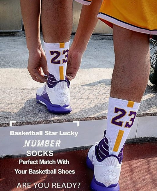 Unique Color Design Features: These socks come in various different color combinations of your favorite teams and players. Number 22, 23, 30, 0, 11, 13, 34. All famous basketball players. Pick and choose your favorite color combination, team and player. Each sock is adorned with the number of a basketball player, adding a unique and personalized touch to your game-day attire. Show off your team pride in style. Fun to give as gifts to the basketball fan.