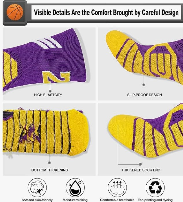 Quality Construction: Our basketball socks are made with love. 77% Polypropylene, 17% Nylon, 3% Elastic, 3% Lycra Spandex. Constructed strong and durable. Will hold up too many washes. Soft to the touch. Made from high-quality materials, these crew socks offer superior comfort, durability, and moisture-wicking properties to keep your feet cool and dry during intense games.