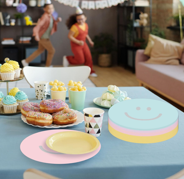 Classic Smiley Face Design/ Four Bright Colors: Our paper place mats are patterned with smile face, colored in blue, pink, purple, yellow, colorful and bright, cute and fresh, suitable for table decoration for any festive event.